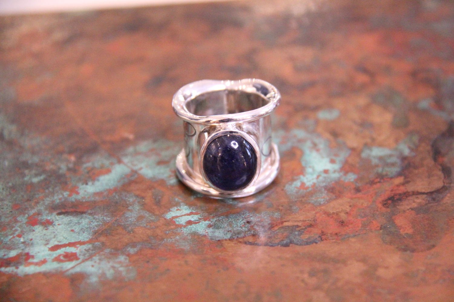 Sterling silver is a high-quality silver for jewellery making. All of Van Peterson’s Sterling Silver jewellery bears the 925 sterling silver stamp. This ring features a large Iolite Cabochon, two Diamonds, and two Sapphire Cabochons.