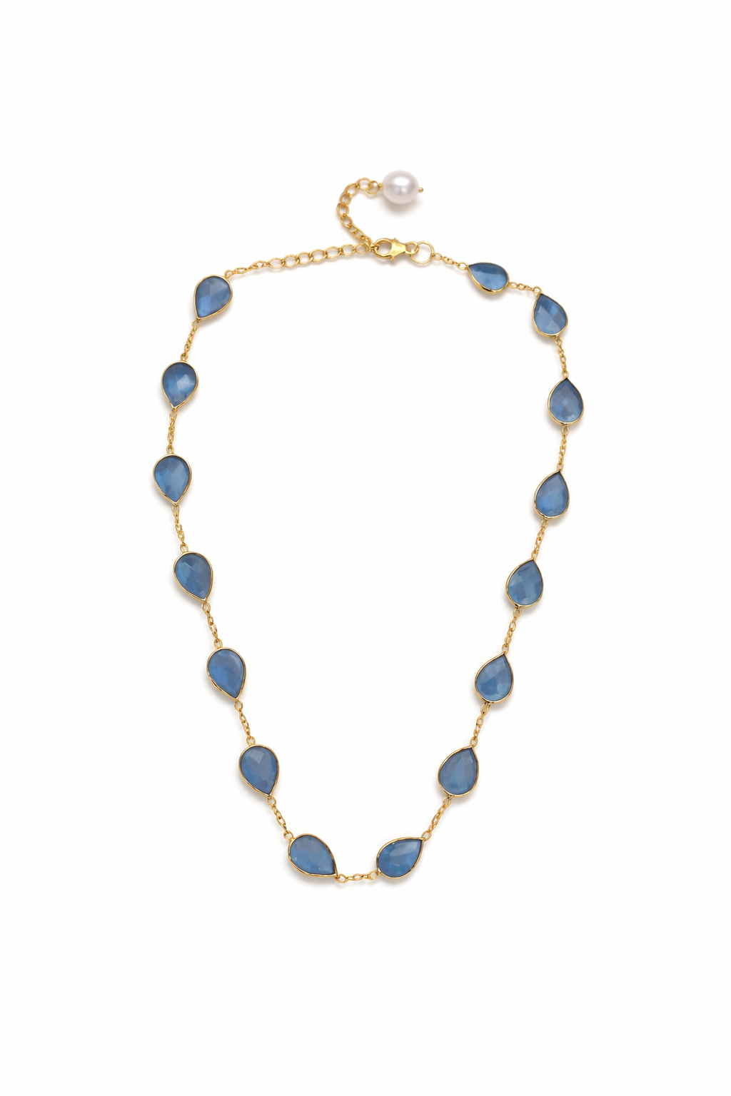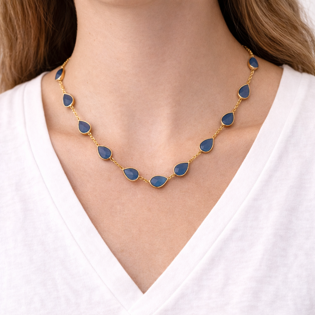 Add a pop of colour to any outfit with the Blue Chalcedony Necklace. This necklace is 18ct yellow gold vermeil over sterling silver.
