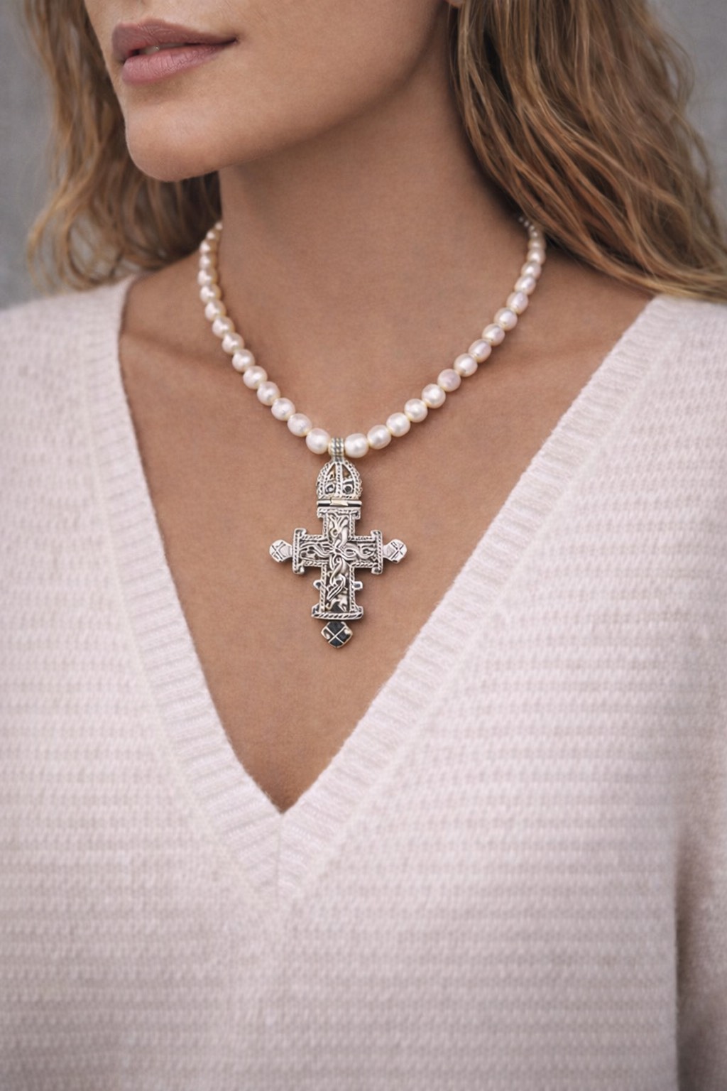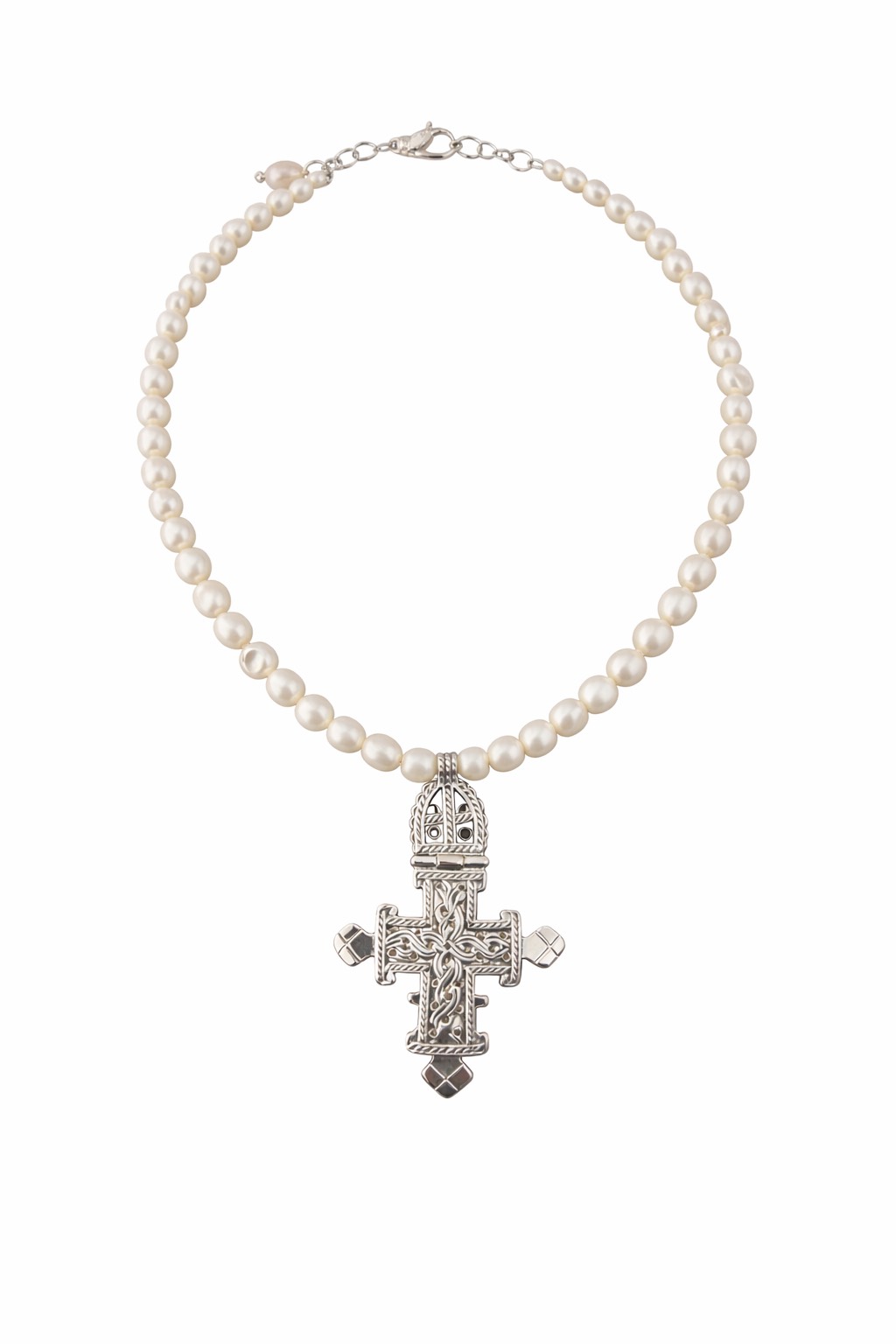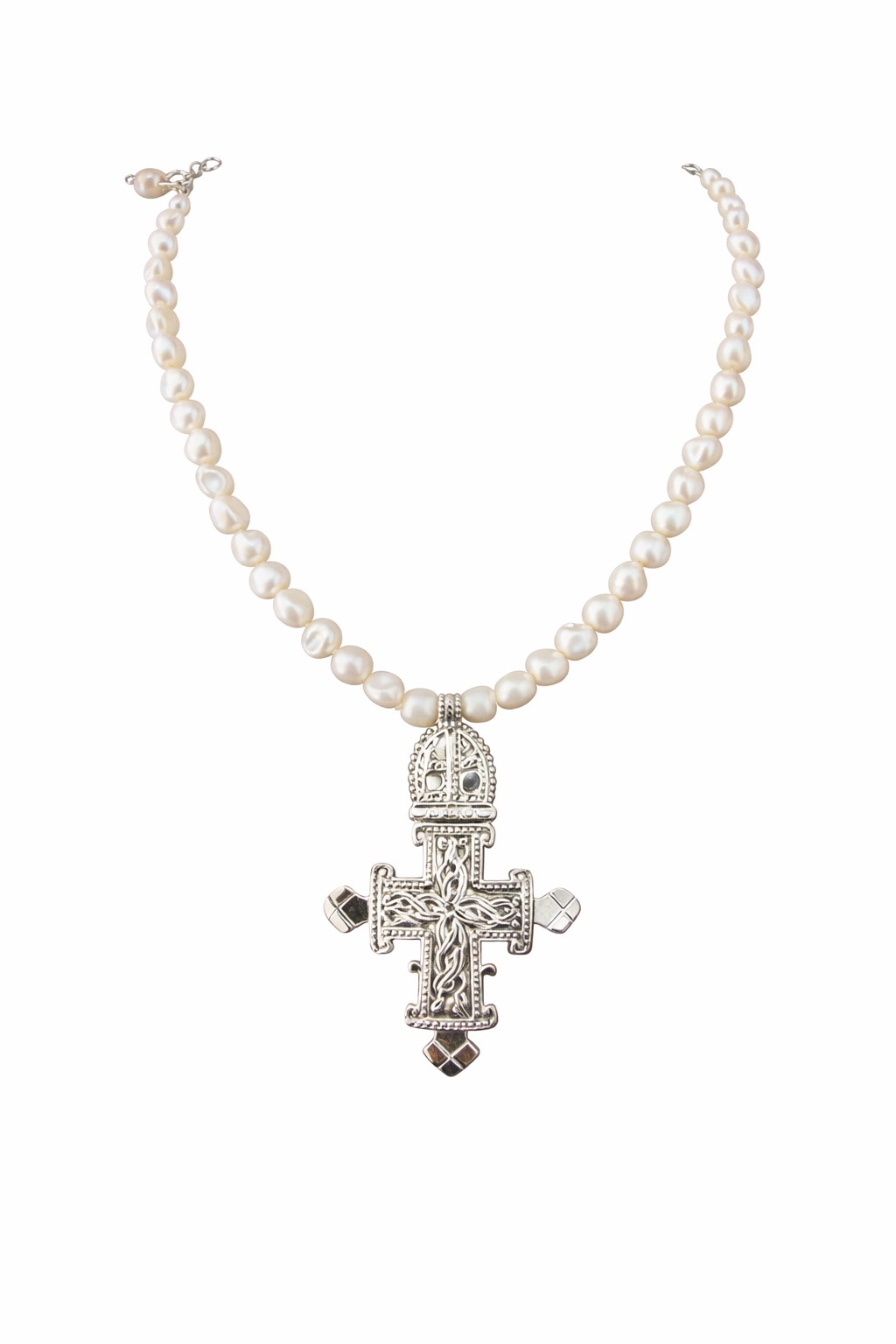 Sterling silver Byzantine cross necklace accenting luminous pearl. Elegant, timeless, and perfect for everyday wear or special occasions.