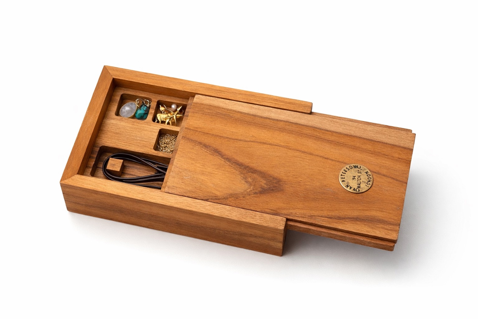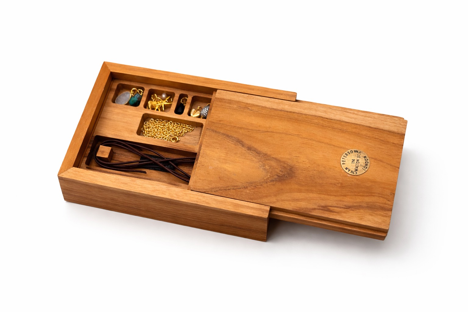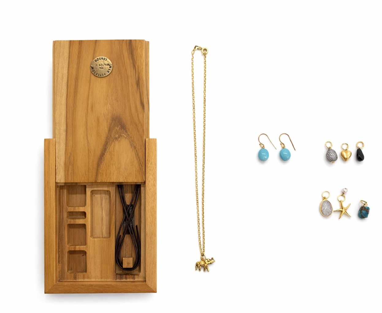 Selection of beautiful charms in 18ct. yellow gold vermeil over sterling silver, mixed with authentic turquoise. The natural wooden box comes with 6 different type of charms, and a pair of turquoise earrings. It also comes with an 18ct. yellow gold vermeil chain; a string of leather, for you to mix & match the charms and decide how to wear them.