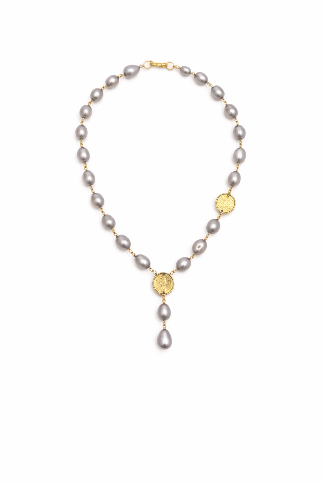 Gray freshwater pearls wired with Sterling Silver vermeil with two discs with a floral pattern.