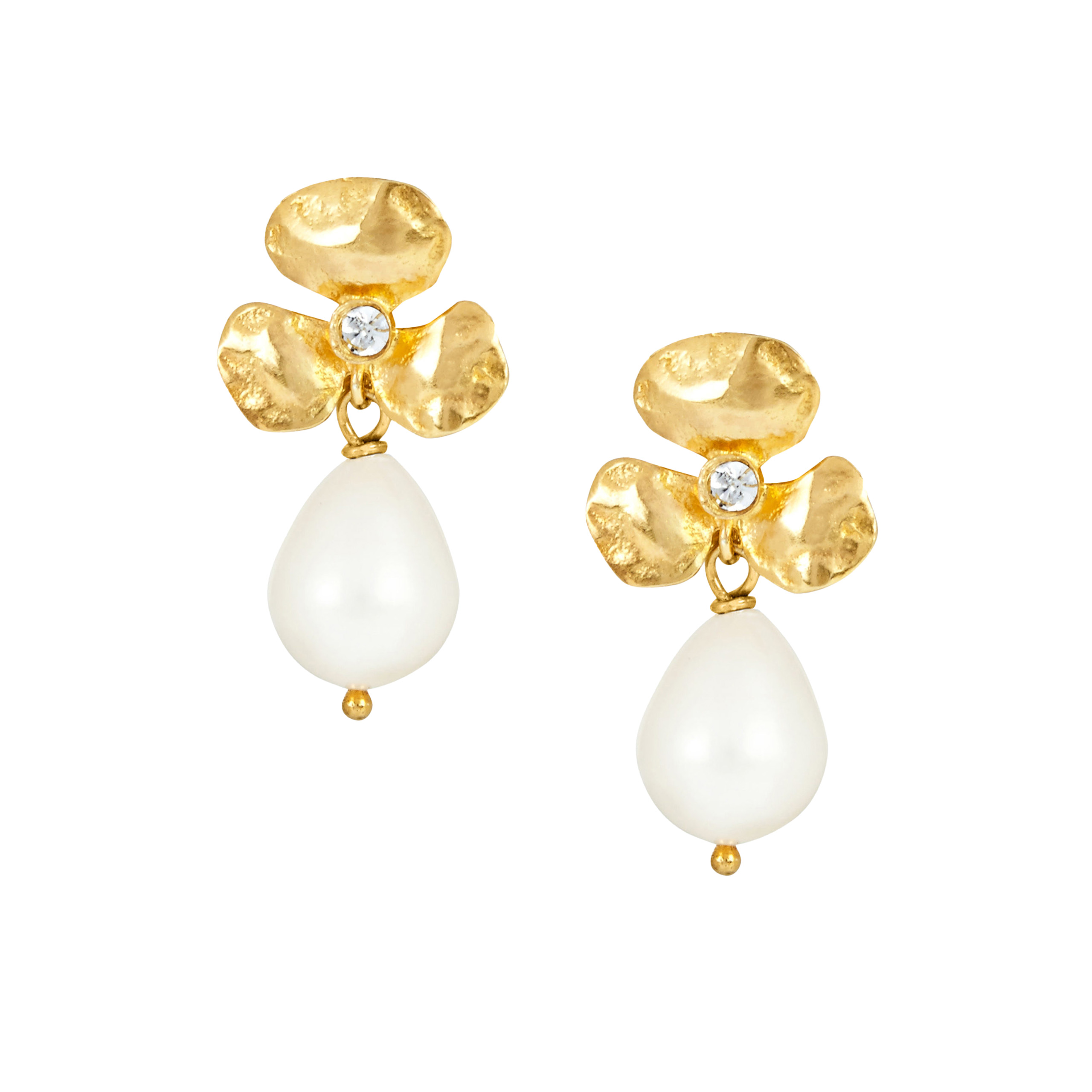 Yellow gold summer pearl clover earrings with freshwater pearl drops, clover stud tops, and crystals. Made in 18ct yellow gold vermeil over sterling silver, these earrings were worn by the late Princess of Wales. Wear them for both special occasions and everyday use.